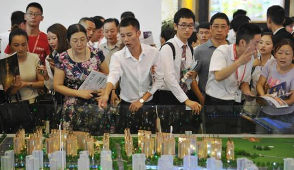 房交會(huì)工作人員向看房咨詢的民眾介紹情況