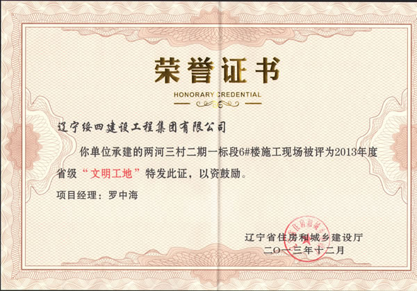 2013年12月由羅忠海項目部承建的兩河三村二期一標段6#樓施工現(xiàn)場被遼寧省住房和城鄉(xiāng)建設(shè)廳評為2013年度省級“文明工地”。