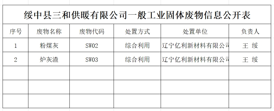 綏中縣三和供暖有限公司一般工業(yè)固體廢物信息公開表