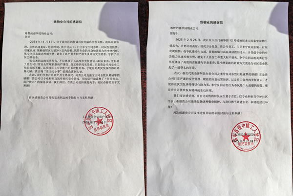 社區(qū)居委會在感謝信中指出,這兩次火災(zāi)事故的成功化解,充分體現(xiàn)了盛華園物業(yè)公司日常嚴謹?shù)陌踩芾、?guī)范的應(yīng)急處置培訓(xùn),以及員工強烈的責任意識。張寶杰同志和李守良同志的英勇行為不僅是個人品德的彰顯,更是盛華園物業(yè)公司優(yōu)質(zhì)服務(wù)精神的生動體現(xiàn)。社區(qū)居委會代表全體居民向盛華園物業(yè)公司及兩位同志致以最誠摯的感謝,并希望盛華園物業(yè)公司繼續(xù)發(fā)揚這種敬業(yè)精神,與社區(qū)攜手共建安全、和諧的居住環(huán)境。