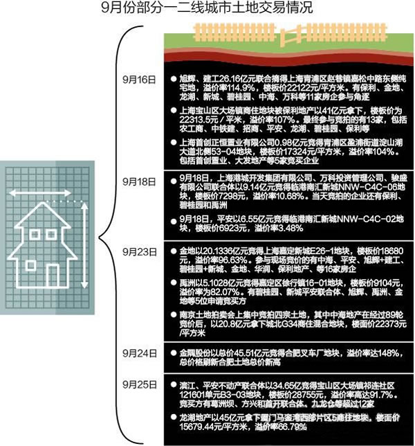 同樣的情況也發(fā)生在其他城市。9月23日,南京土地拍賣會(huì)上集中競(jìng)拍四宗土地,其中中海地產(chǎn)在經(jīng)過89輪競(jìng)價(jià)后,以20.8億元拿下城北G34商住混合地塊,樓面價(jià)22373元/平方米,創(chuàng)造了南京的樓面價(jià)新高。9 月24日,金隅股份以總價(jià)45.51億元競(jìng)得合肥叉車廠地塊,溢價(jià)率達(dá)148%,總價(jià)格創(chuàng)下合肥土地總價(jià)新高。在廈門,9月25日一向行事穩(wěn)健的龍湖地產(chǎn)以45億元拿下廈門馬鑾灣西部片區(qū)5商住地塊,樓面價(jià)15679.44元/平方米,溢價(jià)率66.79%,無(wú)論是總價(jià)還是樓面價(jià)格都創(chuàng)造了廈門當(dāng)?shù)氐男赂摺?/FONT>
