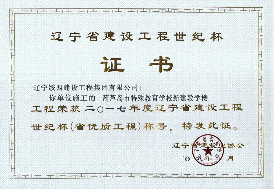 “葫蘆島市特殊教育學(xué)校新建教學(xué)樓工程”榮獲2017年度遼寧省建設(shè)工程世紀杯稱號