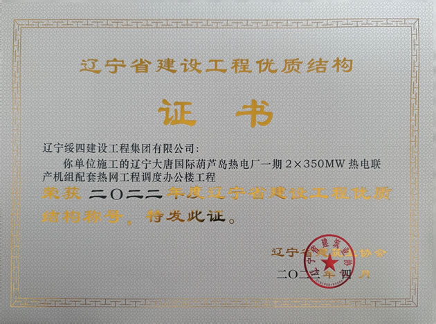 | 遼寧大唐國際葫蘆島熱電廠一期2X350MW熱電聯(lián)產(chǎn)機(jī)組配套熱網(wǎng)工程調(diào)度辦公樓工程榮獲2022年度遼寧省建設(shè)工程優(yōu)質(zhì)結(jié)構(gòu)稱號 |