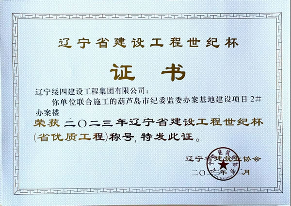 葫蘆島市紀(jì)委監(jiān)委辦案基地建設(shè)項(xiàng)目2#辦案樓 榮獲2023年遼寧省建設(shè)工程世紀(jì)杯(省優(yōu)質(zhì)工程)稱號
